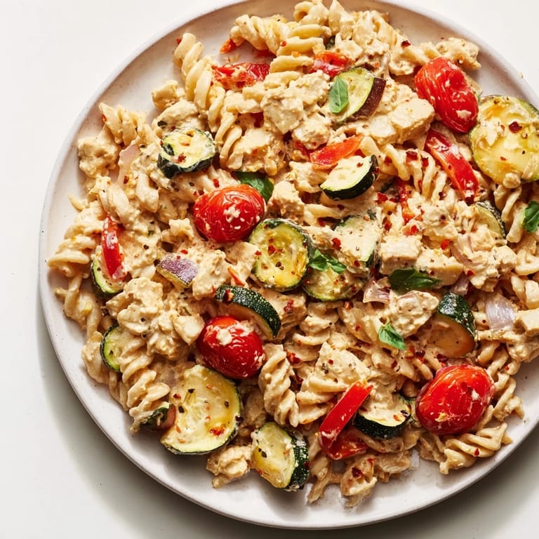 Whole-grain pasta changes the game entirely because it has actual texture and substance that doesn't disappear into creamy sauce. Regular pasta becomes almost invisible when tossed with something this rich, but whole grains stand up and announce themselves, giving you something to chew that feels intentional. The nuttiness of whole wheat or spelt plays beautifully against the tangy feta and sweet roasted vegetables, creating balance without needing to think about it.