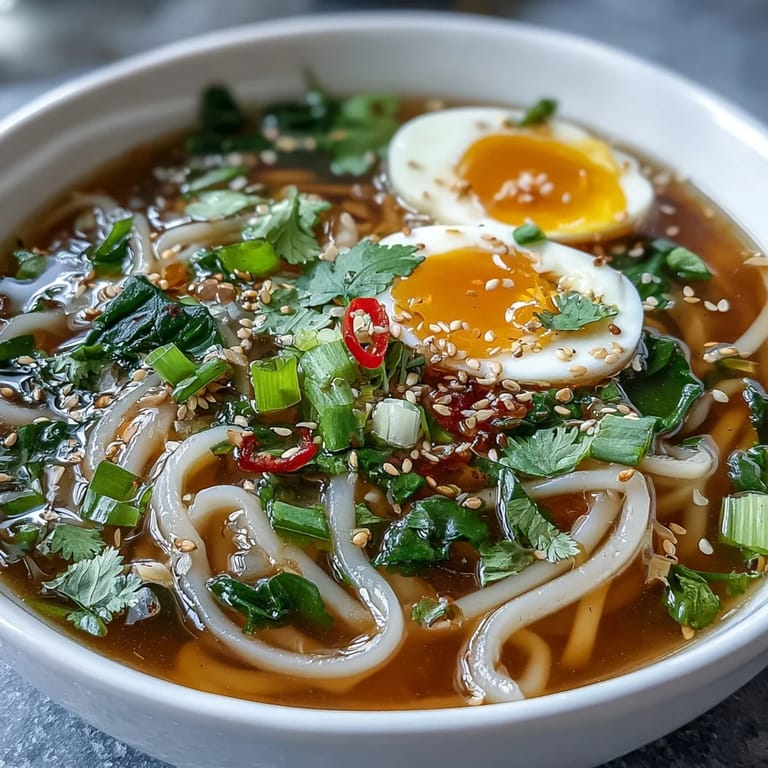 The toppings list is a suggestion, not a mandate, and this is where the recipe gets fun because your bowl becomes uniquely yours. I've added leftover roasted chicken, crispy bacon pieces, tender sheets of nori, even a dollop of spicy miso paste on adventurous nights. The broth stays the same, but the personality shifts completely, which is exactly how I like cooking to feel.